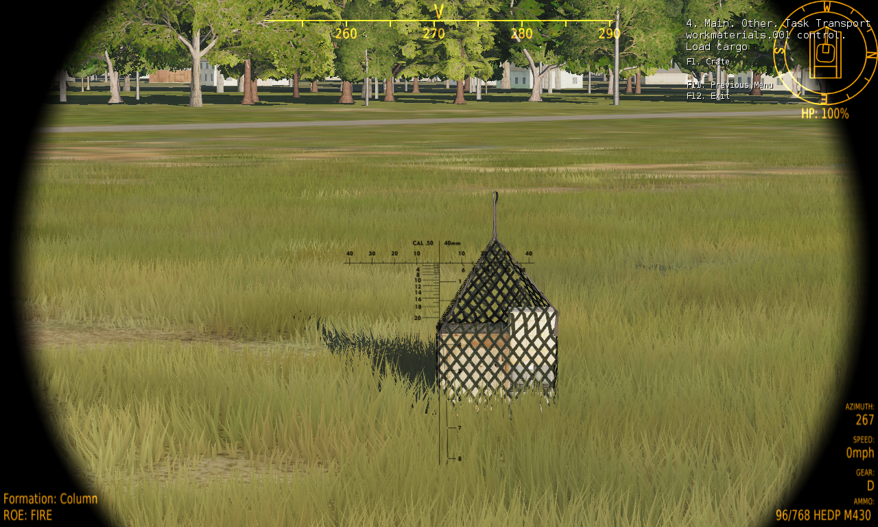 Loading: Stationary cargo (like crates), which are heavy, can only be loaded or sling loaded, meaning, your carrier must be close enough to the cargo to be able to load the cargo within the carrier bays. Moose provides you with an additional menu system to load stationary cargo into your carrier bays using the menu. These menu options will become available, when the carrier is within loading range. The Moose cargo will report to the carrier when the range is close enough. The load range is set by the mission designer.
