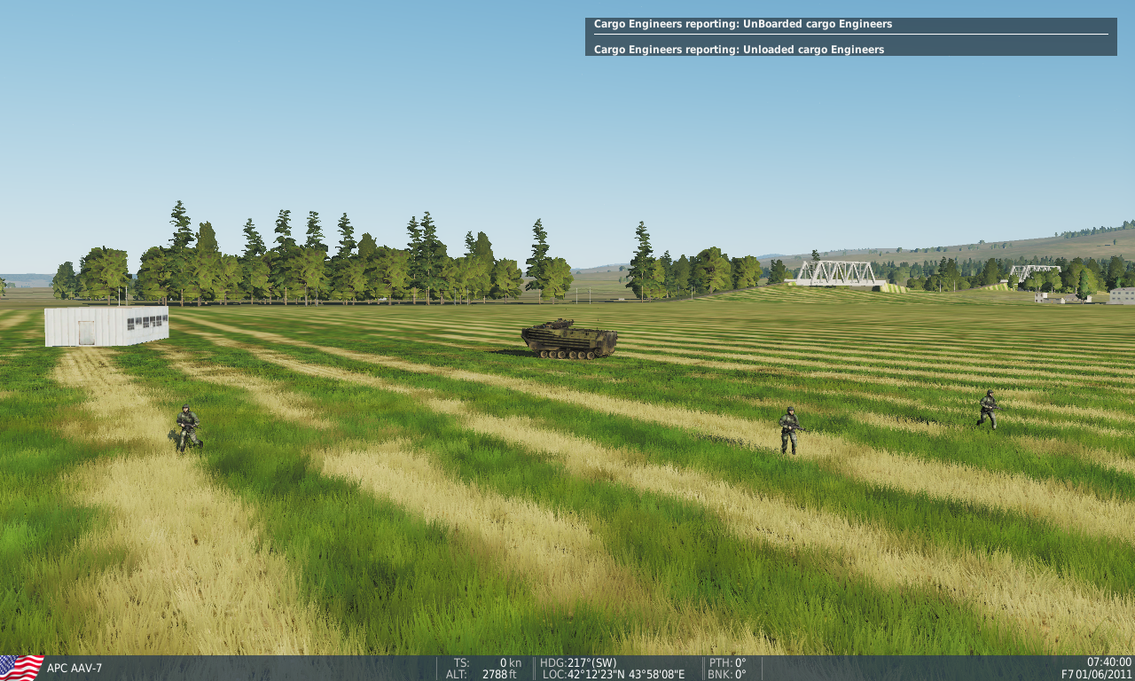 Boarding: Moveable cargo (like infantry or vehicles), can be boarded, that means, the cargo will move towards your carrier to board. However, it can only execute the boarding actions if it is within the foreseen Reporting Range. Therefore, it is important that you steer your Carrier within the Reporting Range around the cargo, so that boarding actions can be executed on the cargo. The reporting range is set by the mission designer. Fortunately, the cargo is reporting to you when it is within reporting range.