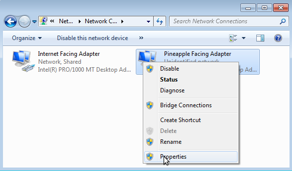 Begin by powering on the WiFi Pineapple and directly connecting an Ethernet cable between the WiFi Pineapple and PC. Open Network Connections on the PC and view the properties of the Internet-facing adapter.