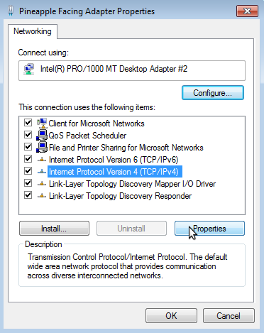 We begin by powering on the WiFi Pineapple and directly connecting an Ethernet cable between the WiFi Pineapple and PC. Open Network Connections on the PC and view the properties of the Internet-facing adapter.