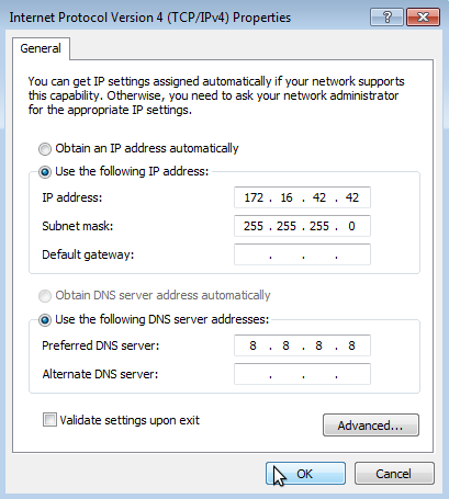 Check Use the following IP address and specify 172.16.42.42 for the IP address and 255.255.255.0 for subnet. Leave the default gateway blank. Next check Use the following DNS server addresses and provide your preferred DNS server (e.g. Google's 8.8.8.8) and click OK then Close.