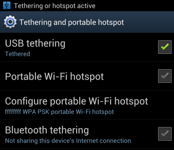 If your Android device support USB Tethering it may be used to provide Internet access to the WiFi Pineapple, sharing either the Android's WiFi or Mobile Broadband connection. To enable, connect a USB cable between the Android device and the WiFi Pineapple. With the WiFi Pineapple powered on and a USB cable connected between both devices, tethering is now possible.