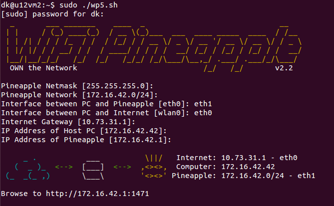 By default the WiFi Pineapple has an IP address of 172.16.42.1 and will assign WiFi clients with IP addresses in teh 172.16.42.100-150 range via an onboard DHCP server. The default gateway of the WiFi Pineapple is 172.16.42.42. This means the WiFi Pineapple is looking for an Internet connection from a host with this IP address. A simple tethering script is available for Linux host which will automatically setup the IP and forwarding. Download the script from the scripts directory here