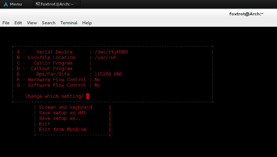 Next, after install minicom with your favourite package manager, open it as root with sudo minicom -s and enter into the 'Serial Port Setup' option. It will present you with a screen similiar to this, you need to change your existing commands to these, with the /dev/ttyUSB0 reflecting your adaptor name:
