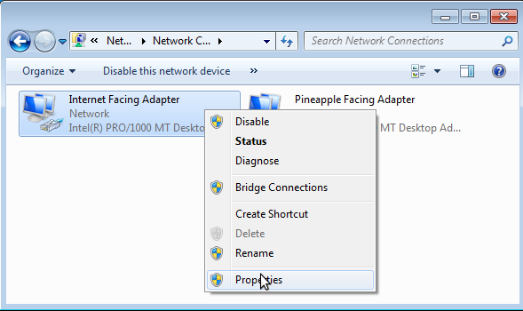 Begin by powering on the WiFi Pineapple and directly connecting an Ethernet cable between the WiFi Pineapple and PC. Open Network Connections on the PC and view the properties of the Internet-facing adapter.